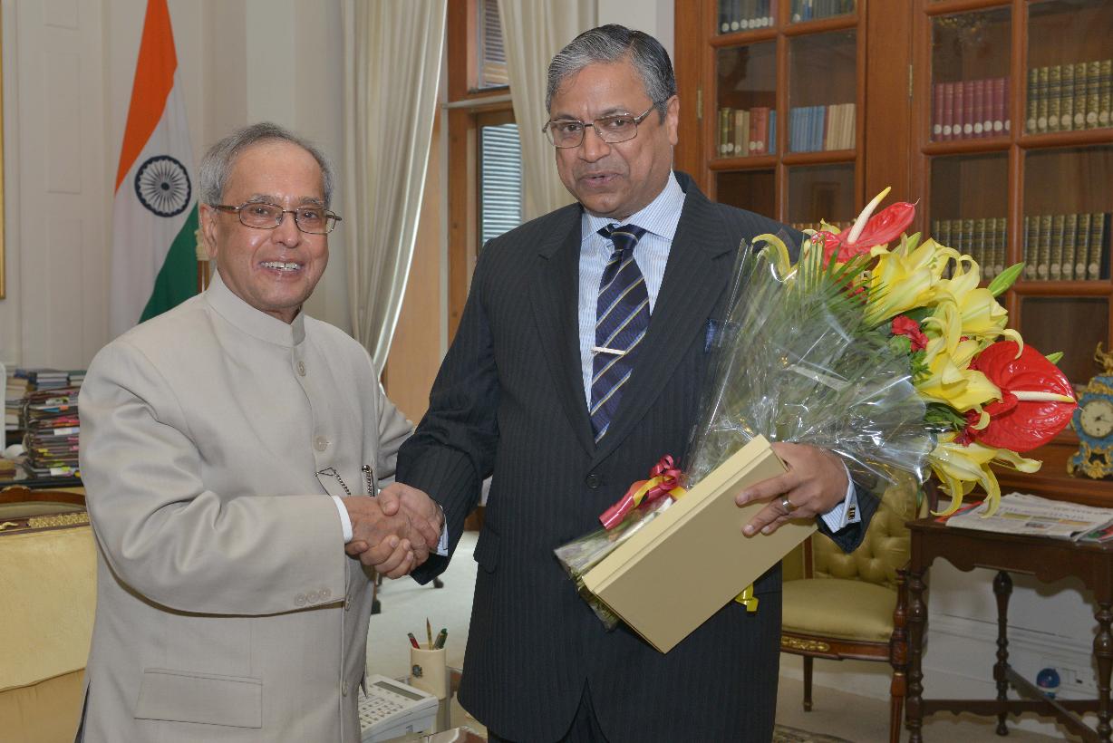 The President of India, Shri Pranab Mukherjee meeting the former Solicitor General of India, Shri Gopal Subramanium, at Rashtrapati Bhavan, in New Delhi on June 27, 2015.