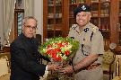 The President of India, Shri Pranab Mukherjee receiving a farewell call from Shri H.M. Meena DCP (Security), Rashtrapati Bhavan Security alongwith his son Shri Vikram Meena, at Rashtrapati Bhavan, in New Delhi on July 31, 2015.