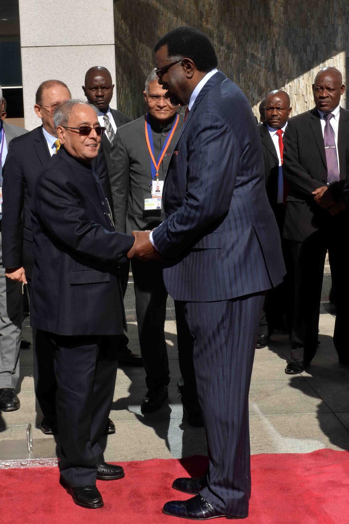 The President of India, Shri Pranab Mukherjee being received by the President of the Republic of Namibia, H.E. Dr. Hage G. Geingob at the Ceremonial Reception, at State House, in Windhoek, Republic of Namibia on June 16, 2016.