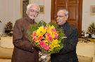 The President of India, Shri Pranab Mukherjee being greeted by the Vice-President of India, Shri Mohd. Hamid Ansari, on the occasion of his 80th birthday, at Rashtrapati Bhavan on December 11, 2015 .