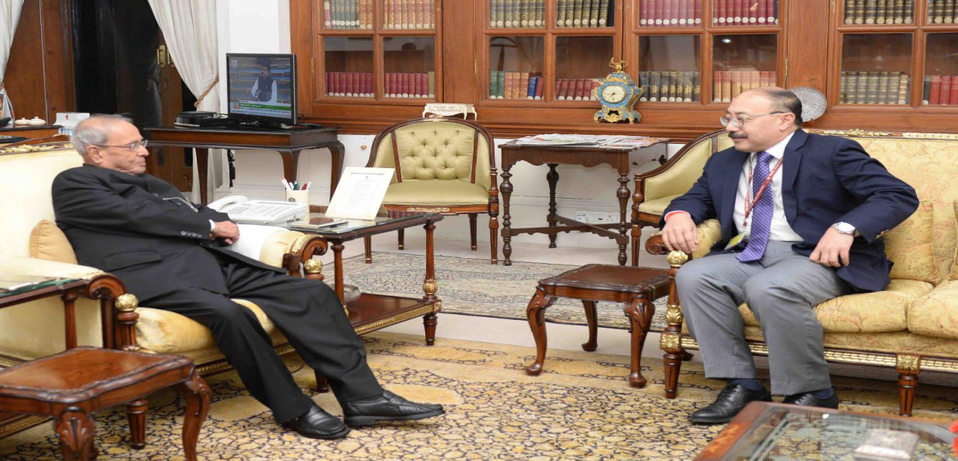 The President of India, Shri Pranab Mukherjee meeting with Shri Harsh Vardhan Shringla, High-Commissioner designate of India to Bangladesh, at Rashtrapati Bhavan on November 23, 2015.