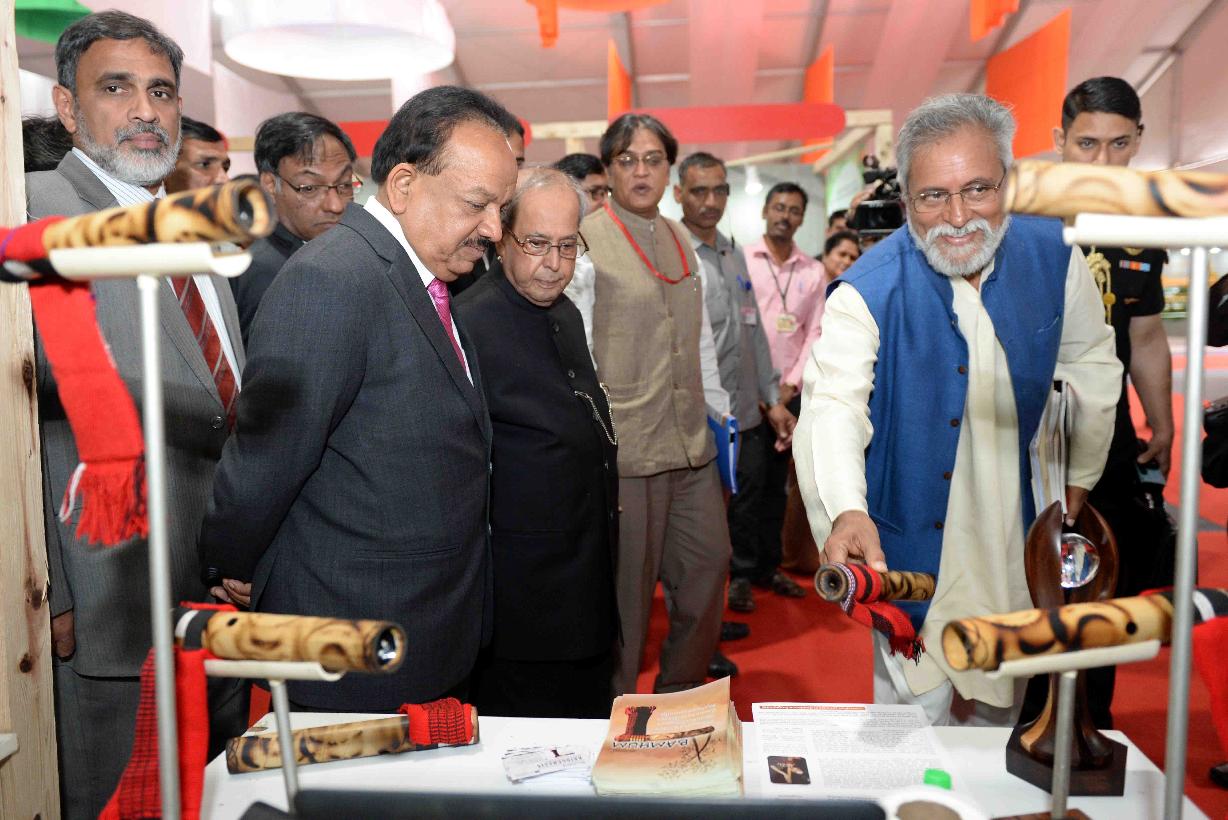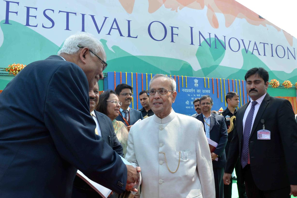 The President of India, Shri Pranab Mukherjee receiving the first copy of Booklet on Festival of Innovation 2105 from the Union Minister of Science and Technology, Dr. Harsh Vardhan, at the inauguration of the Innovation Exhibition, at Sports Ground in President s Estate on March 12, 2016.