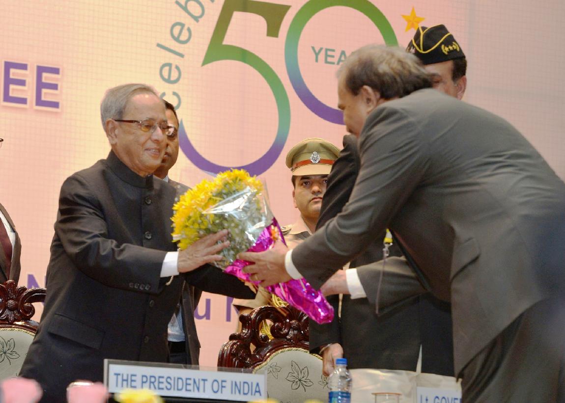 The President of India, Shri Pranab Mukherjee receiving the First Copy of the Golden Jubilee Souvenir from the Union Minister of Health and Family Welfare, Dr Harsh Vardhan at the Golden Jubilee Celebration of Jawaharlal Institute of Postgraduate Medical Education & Research (JIPMER) at Puducherry on Sep 26, 2014