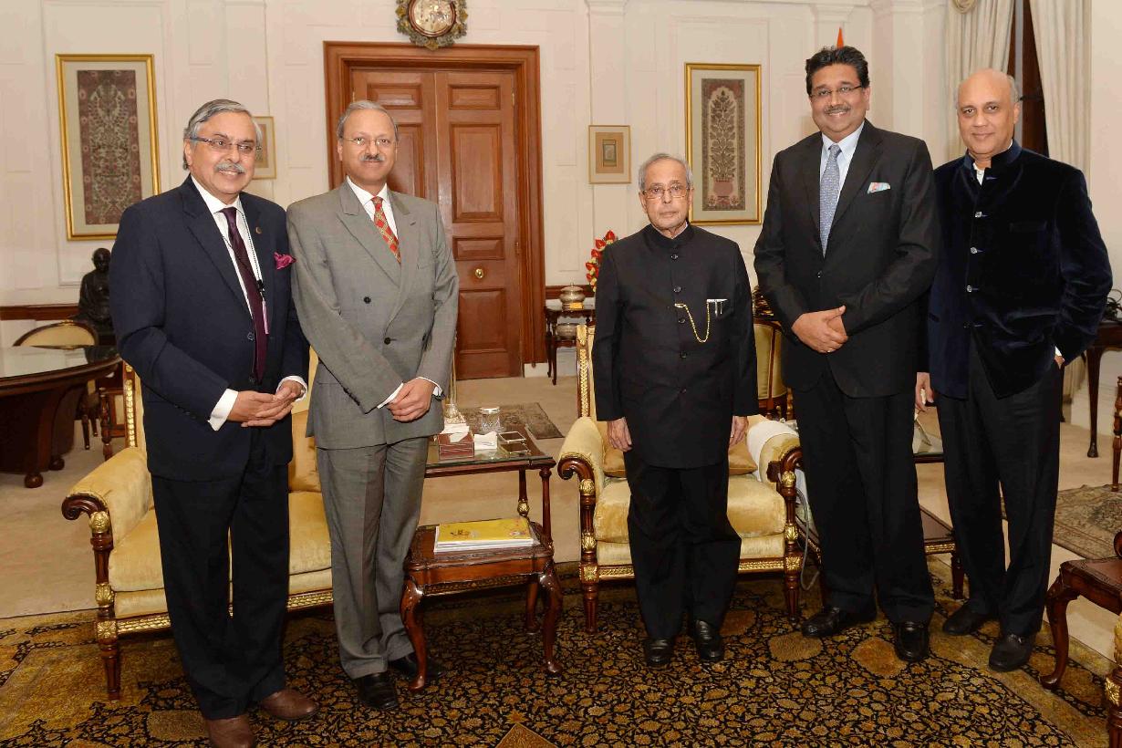 The President of India, Shri Pranab Mukherjee meeting with Shri Harshvardhan Neotia, President, Federation of Indian Chambers of Commerce and Industry with others, at Rashtrapati Bhavan on March 01, 2016.