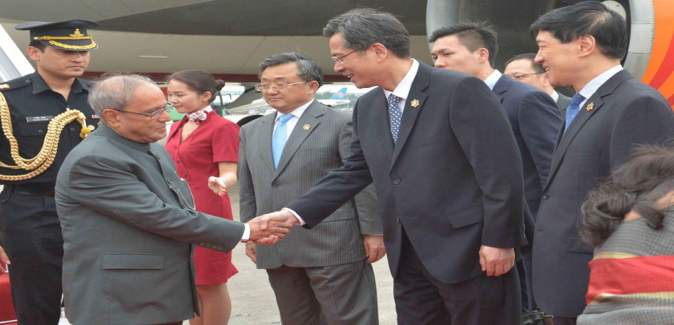The President of India, Shri Pranab Mukherjee being received by Mr. He Zhongyou, Vice Governor of Guangdong, Mr. Liu Zhenmin, Chinese Vice Foreign Minister and other Goverment Officials on his arrival at Guangzhou, The People s Republic of China on May 24, 2016.
