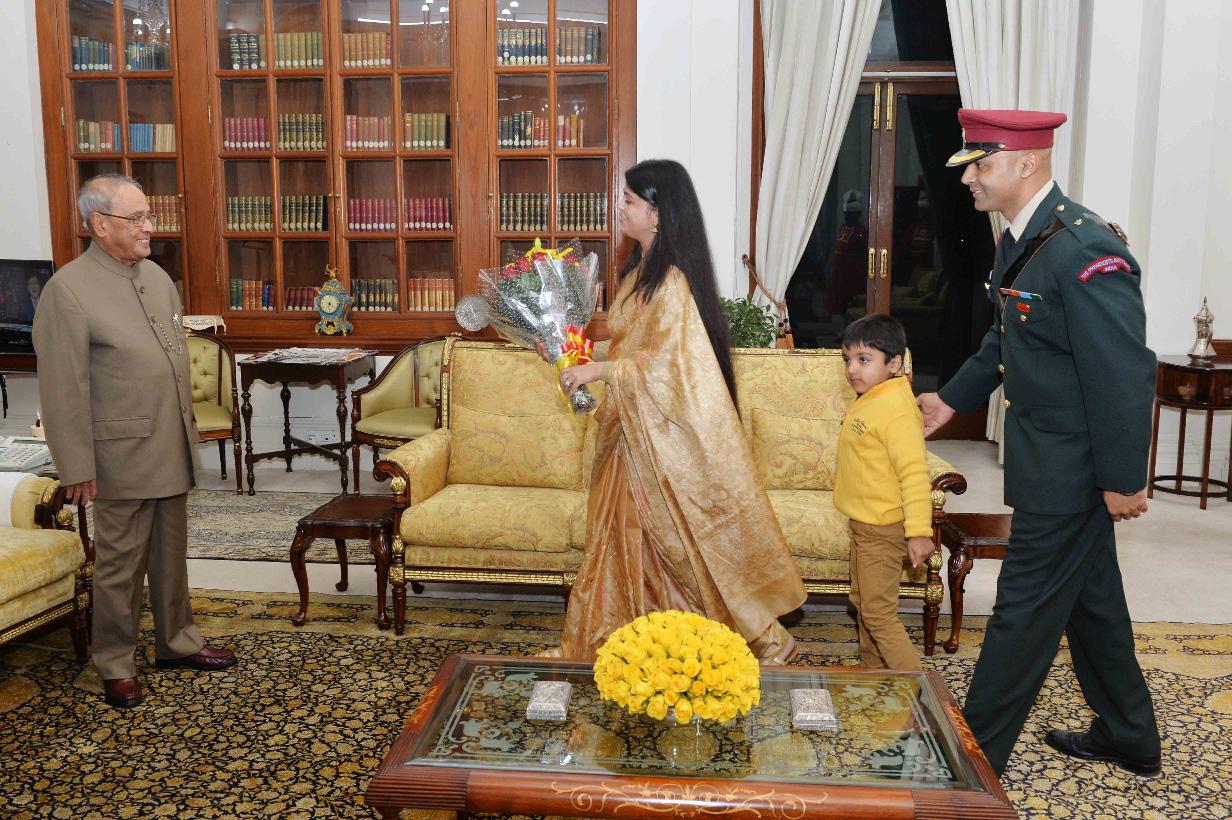 The President of India, Shri Pranab Mukherjee meeting with Smt. & Maj. Himmat Singh, Technical Officer, The President's Bodyguard, during a farewell call, at Rashtrapati Bhavan on January 10, 2017.