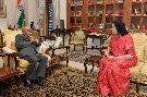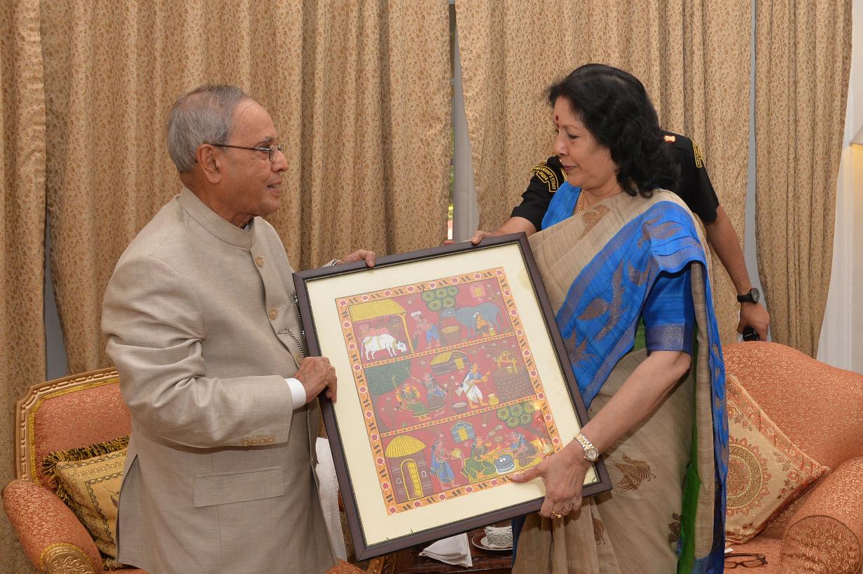 The President of India, Shri Pranab Mukherjee meeting with Dr. J. Geeta Reddy, former Minister, Andhra Pradesh, at Rashtrapati Bhavan, in New Delhi on August 21, 2015.