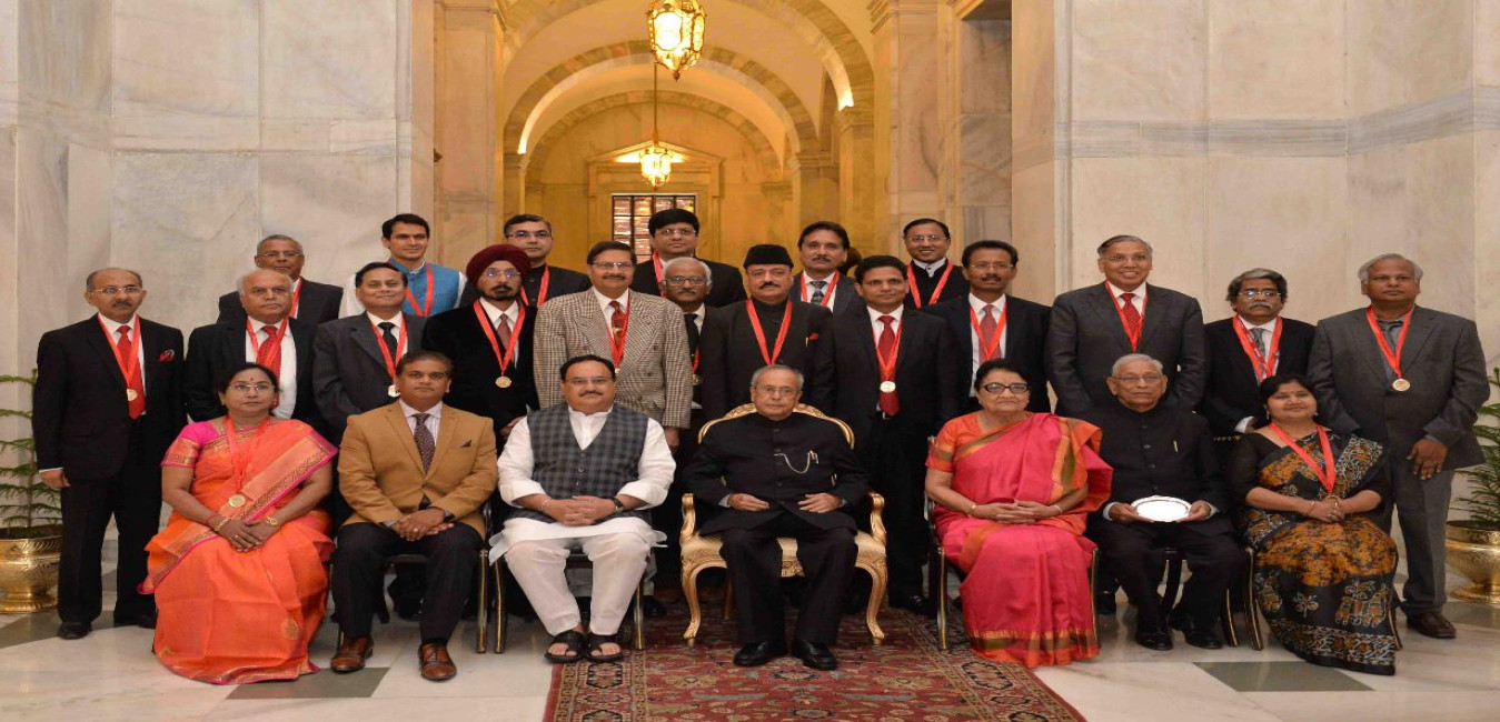 The President of India, Shri Pranab Mukherjee with the recipients of Dr. B.C. Roy National awards for the year 2014,2015 & 2016 and Hari Om Ashram Alembic Research Awards for the years 2008, 2009, 2010, 2014, 2015 & 2016, at Rashtrapati Bhavan on March 28, 2017.