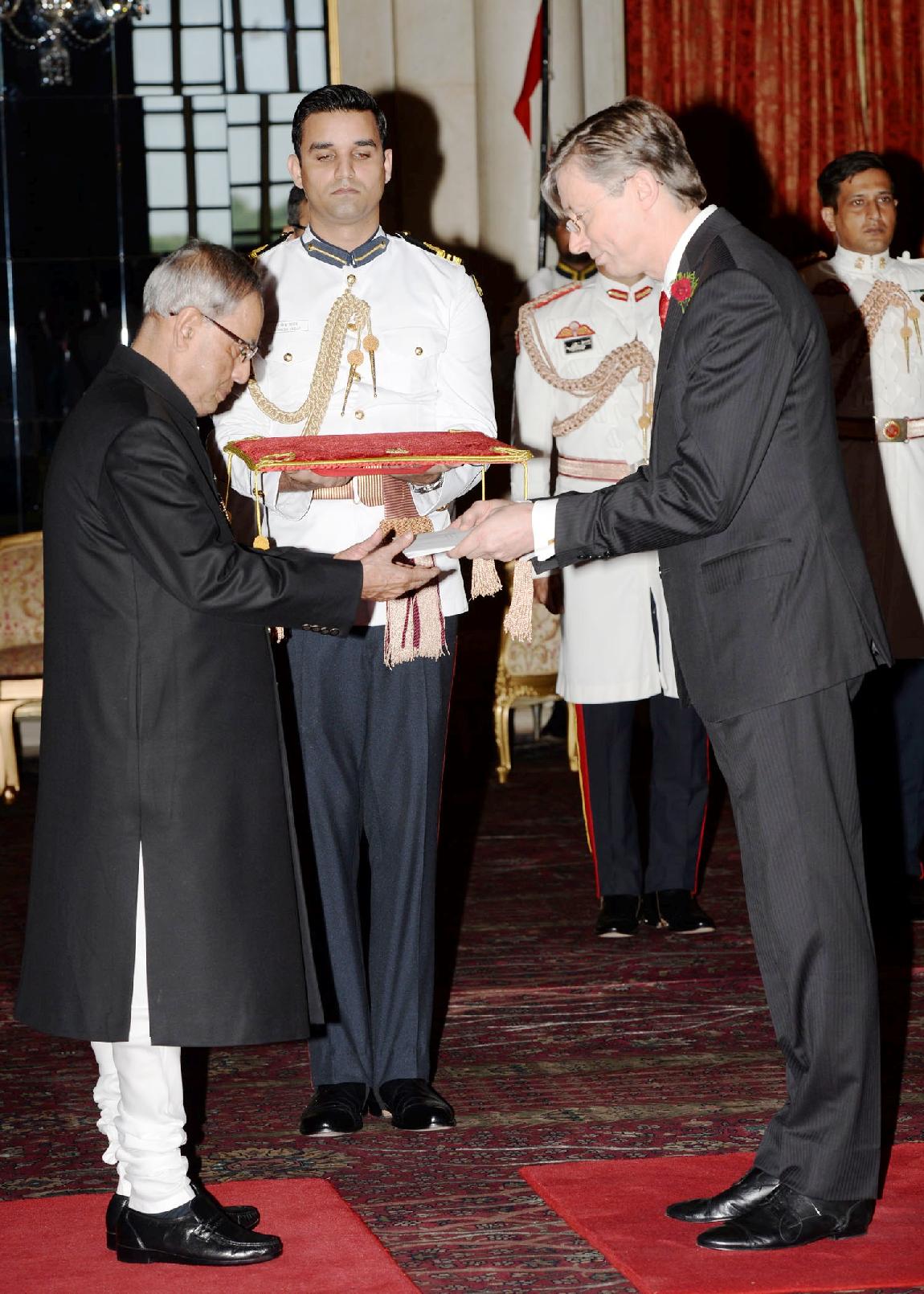 The Ambassador-Designate of Belgium, His Excellency Mr Jan Luykx presenting his credentials to the President of India, Shri Pranab Mukherjee at Rashtrapati Bhavan in New Delhi on Sep 25, 2014