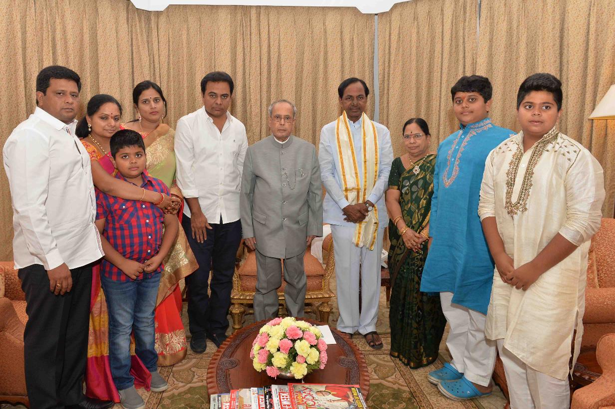 The President of India, Shri Pranab Mukherjee meeting with the Chief Minister of Telangana, Shri K. Chandrashekar Rao alongwith his family, at Rashtrapati Nilayam, Bolarum, in Secunderabad on December 28, 2015.