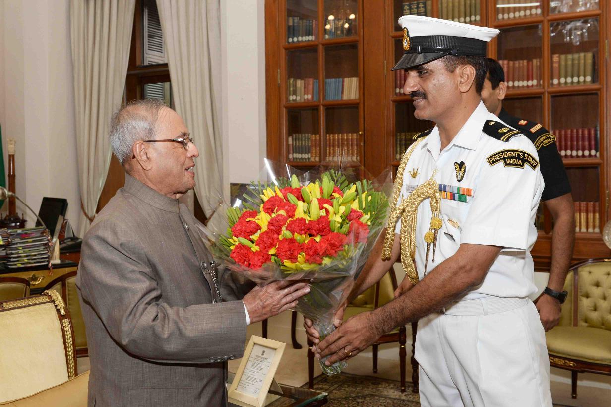 The President of India, Shri Pranab Mukherjee meeting with MCPO K.S. Katoch, JCO ADC to the President, at Rashtrapati Bhavan on May 04, 2016.