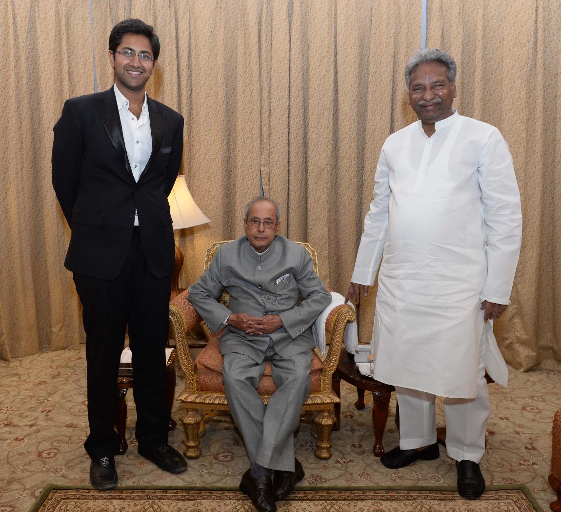 The President of India, Shri Pranab Mukherjee meeting with Shri K.S. Rao, former Union Minister for Textile alongwith his grandson Shri Sribharat Mathukumilli, at Rashtrapati Nilayam, Bolarum, in Secunderabad on December 28, 2016.