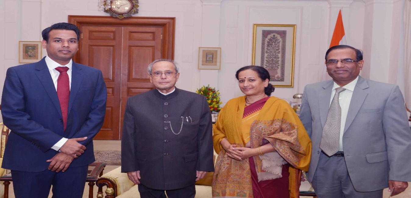The President of India, Shri Pranab Mukherjee meeting with Dr. Kameshwar Prasad of AIIMS along with his wife Smt. Meeta, at Rashtrapati Bhavan on January 13, 2016.