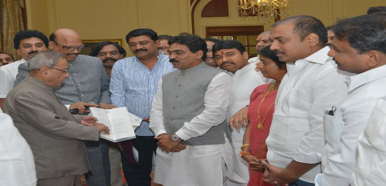 The President of India, Shri Pranab Mukherjee interacting with Shri L Rajagopal MP with Delegation of Andhra Pradesh at Rashtrapati Bhavan in New Delhi on Oct 24, 2013