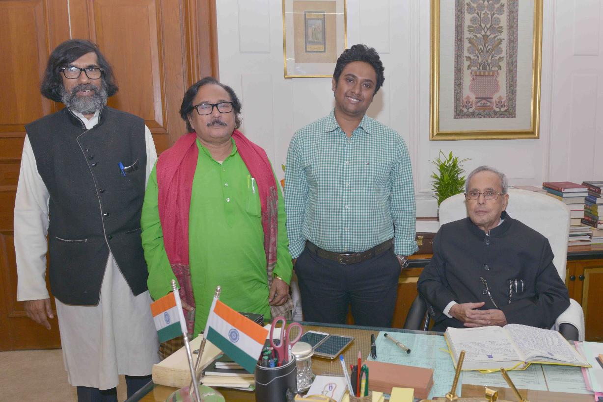 The President of India, Shri Pranab Mukherjee meeting with Shri Laxman Seth, Ex-MP with others, at Rashtrapati Bhavan on February 24, 2016.
