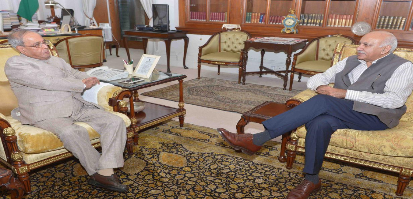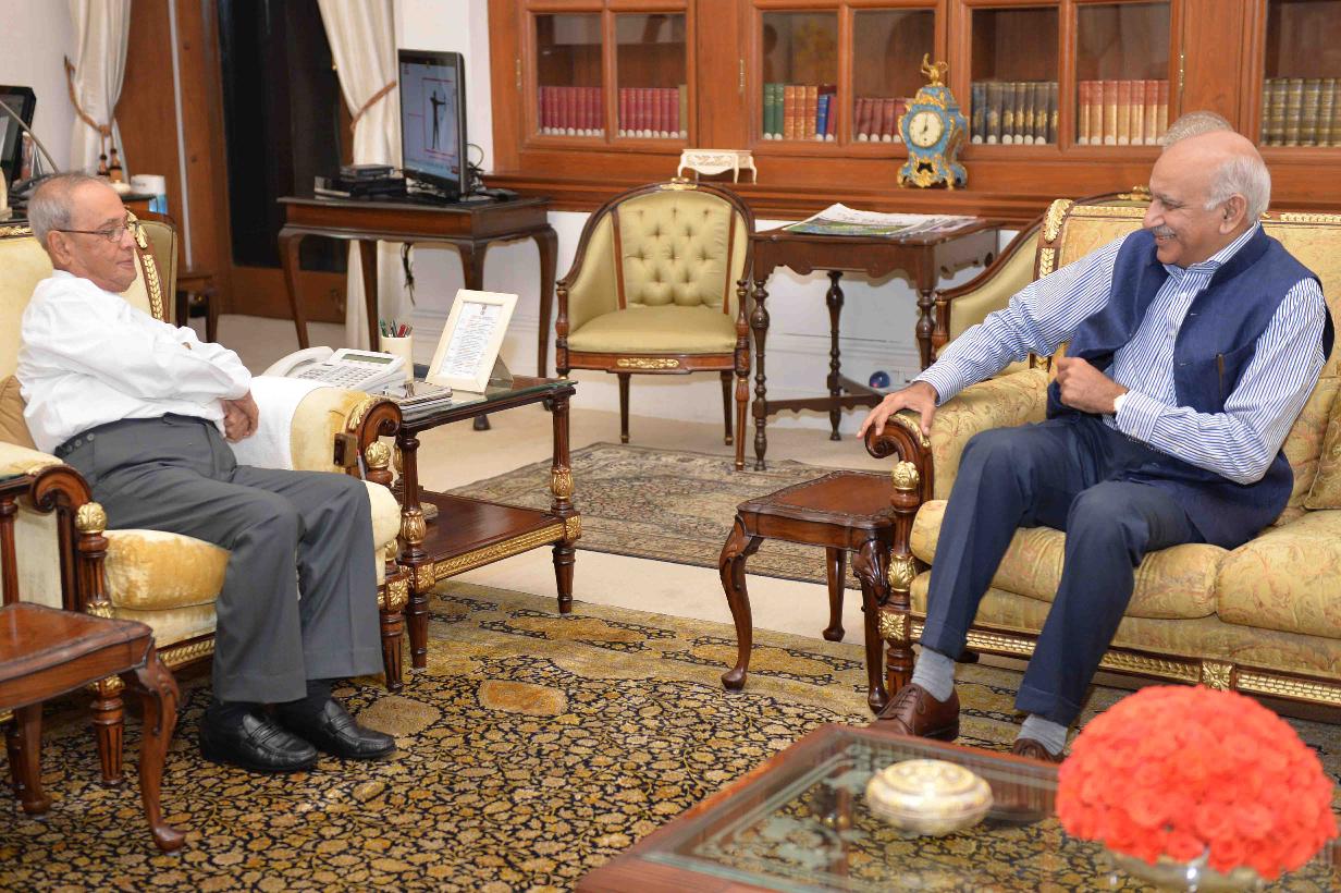 The President of India, Shri Pranab Mukherjee meeting with Shri M.J. Akbar, Minister of State for External Affairs, at Rashtrapati Bhavan on July 18, 2016.
