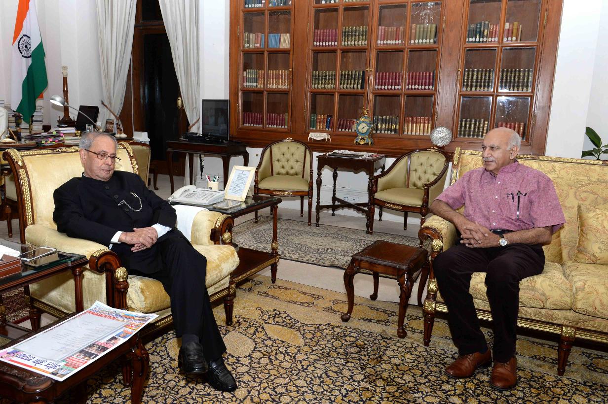 The President of India, Shri Pranab Mukherjee meeting with Shri M.J. Akbar, at Rashtrapati Bhavan, in New Delhi on October 03, 2015.