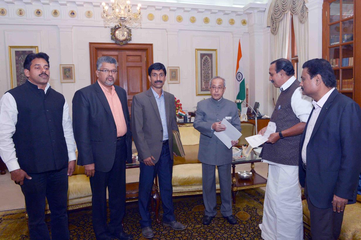 The President of India, Shri Pranab Mukherjee meeting with Shri M.K. Raghavan MP(LS) alongwith Dr. Manoj Kaloor and others from Global Ayurveda Festival, Kozhikode, at Rashtrapati Bhavan on December 04, 2015.