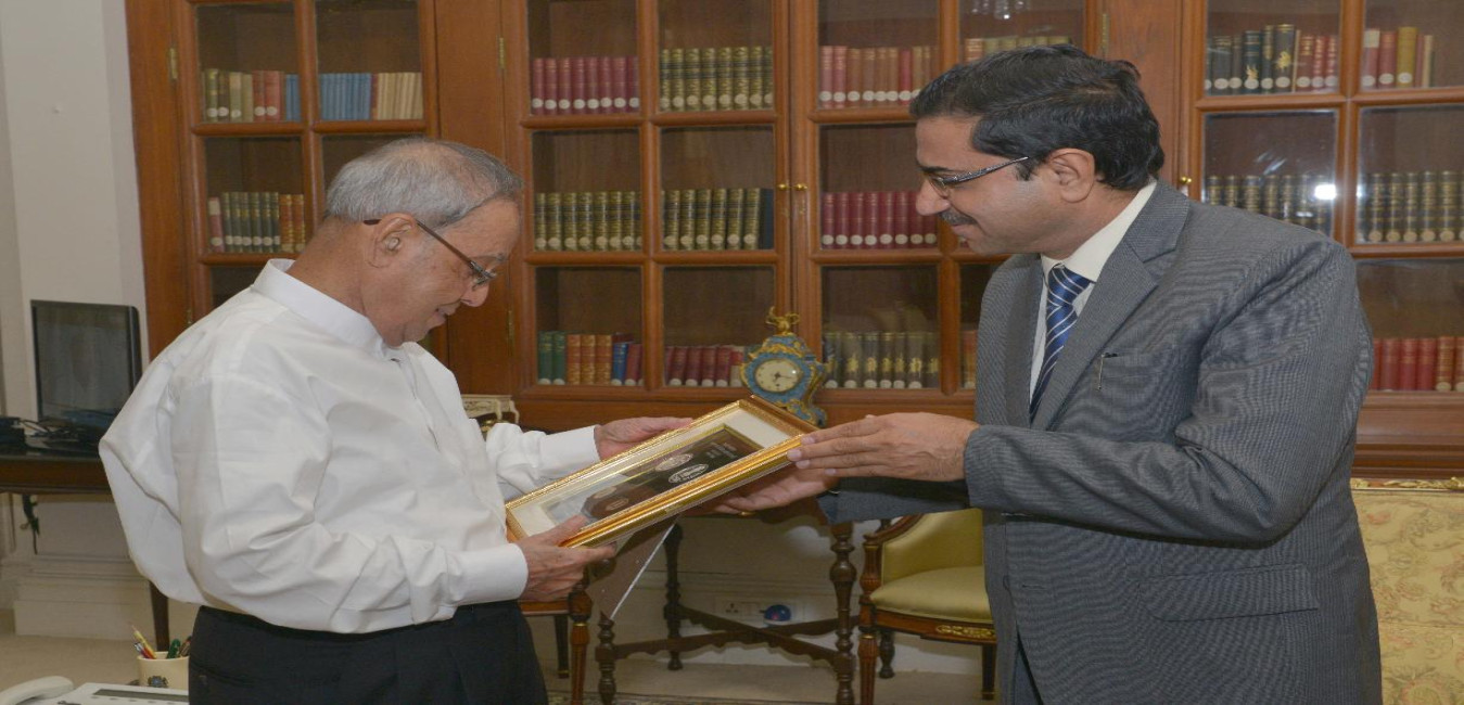 The President of India, Shri Pranab Mukherjee meeting the Chairman-cum-Managing Director, Security Printing & Minting Corporation of India Ltd, Shri M.S. Rana, at Rashtrapati Bhavan, in New Delhi on July 17, 2015.