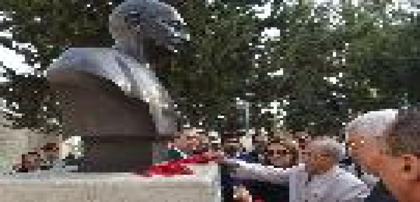 The President of India, Shri Pranab Mukherjee alongwith the President of Palestine, Mr. Mahmoud Abbas paying floral tributes at the bust of Mahatma Gandhi, at Garden of Nations, in Ramallah, Palestine on October 12, 2015.