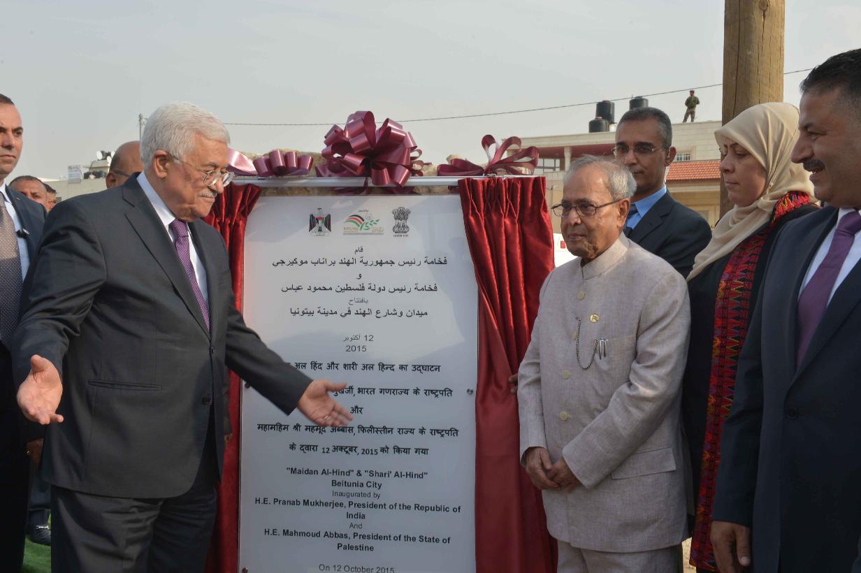 The President of India, Shri Pranab Mukherjee and the President of Palestine, Mr. Mahmoud Abbas during Road Naming Ceremony (Sharia-al-Hind) and Inauguration of a roundabout (Midan-al-Hind) at Beitunia, Ramallah in Palestine on October 12, 2015.