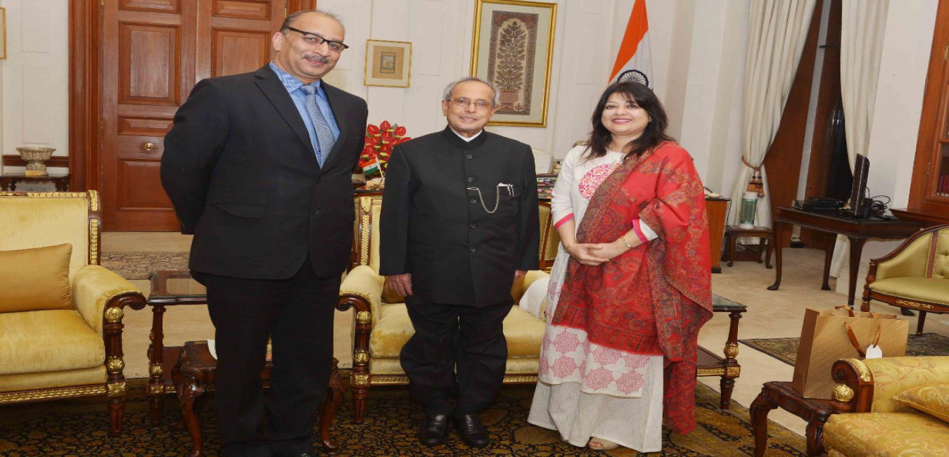 The President of India, Shri Pranab Mukherjee meeting with Smt. & Shri Manoj Pant, at Rashtrapati Bhavan on January 14, 2016.