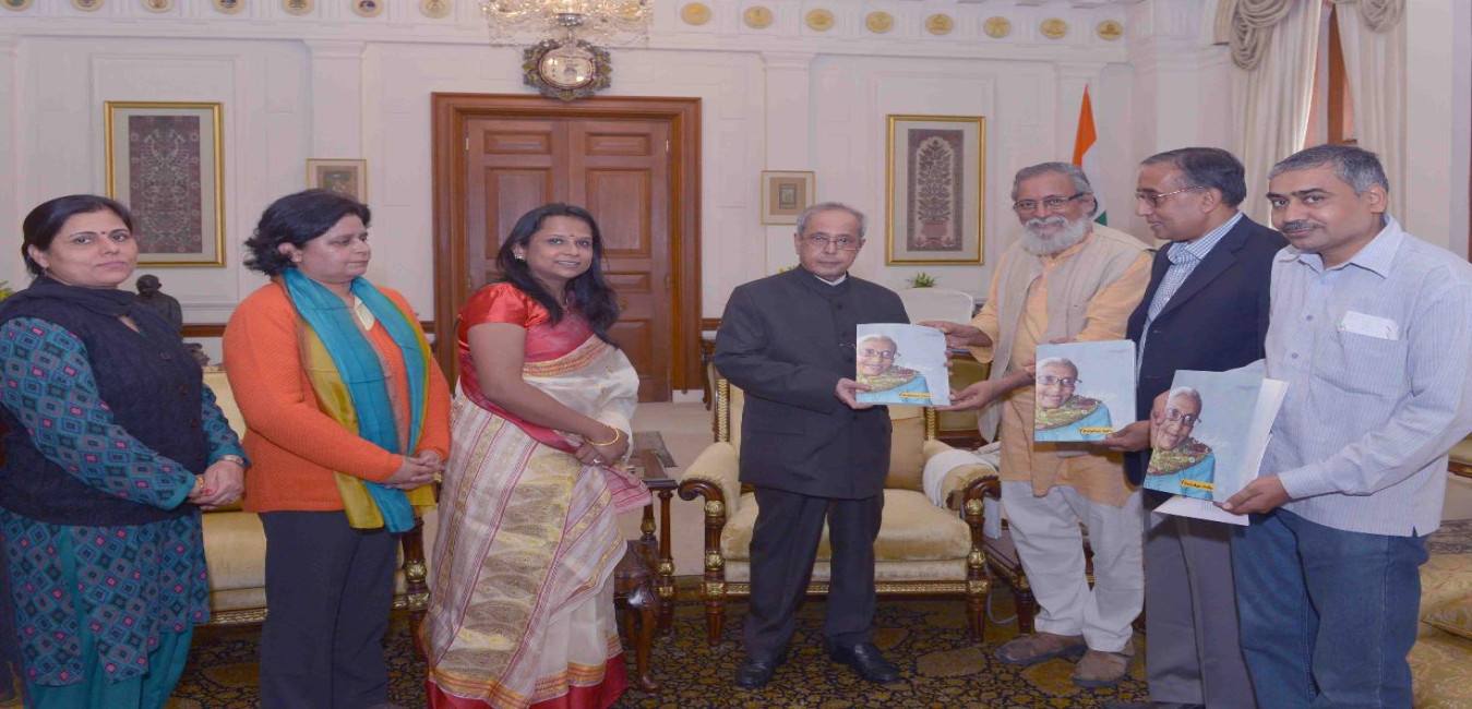 The President of India, Shri Pranab Mukherjee receiving a book 'Shatayu' from Shri Mathew Cherian, Chief Executive Officer, HelpAge India alongwith Prof. Anil Gupta and others from HelpAge India and SRISTI Foundation, at Rashtrapati Bhavan on November 26, 2015.
