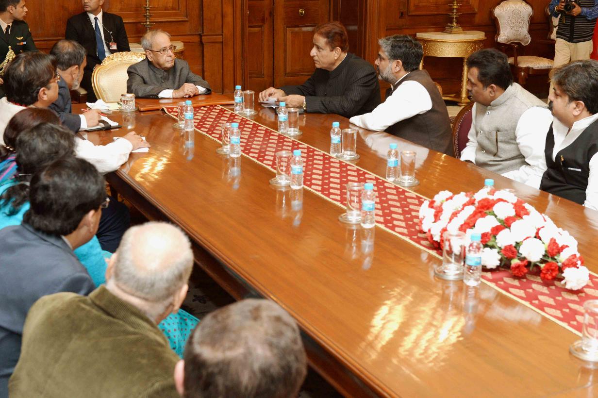 The President of India, Shri Pranab Mukherjee meeting with a delegation of Samajwadi Party MPs, MLAs, MLCs & leaders led by Shri Mohd. Azam Khan, National General Secretary, Samajwadi Party and Minister in Uttar Pradesh Govt., at Rashtrapati Bhavan on November 29, 2016.