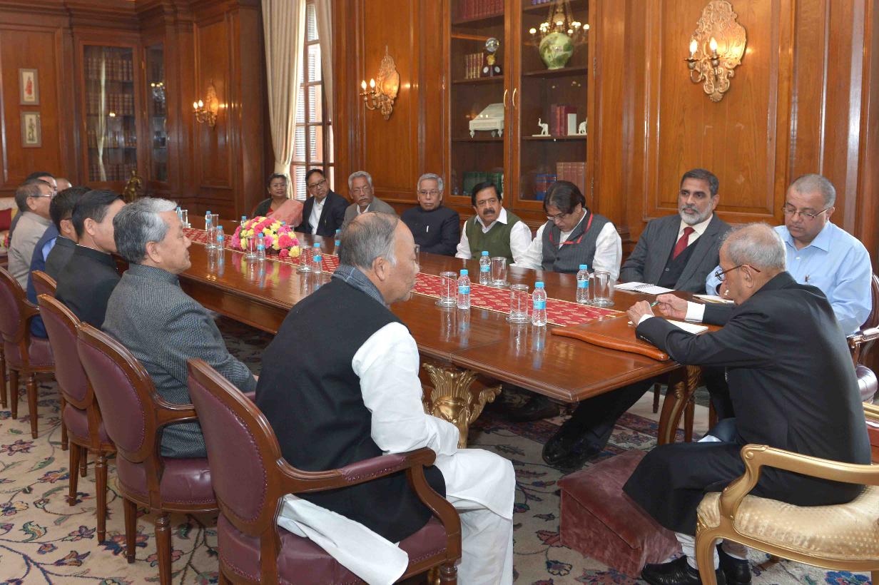 The President of India, Shri Pranab Mukherjee meeting with Shri O. Ibobi Singh, Chief Minister of Manipur, Shri Ramesh Chennithala, Ex-MP along with a delegation of MPs, Ministers & MLA of Manipur, at Rashtrapati Bhavan on January 04, 2017.