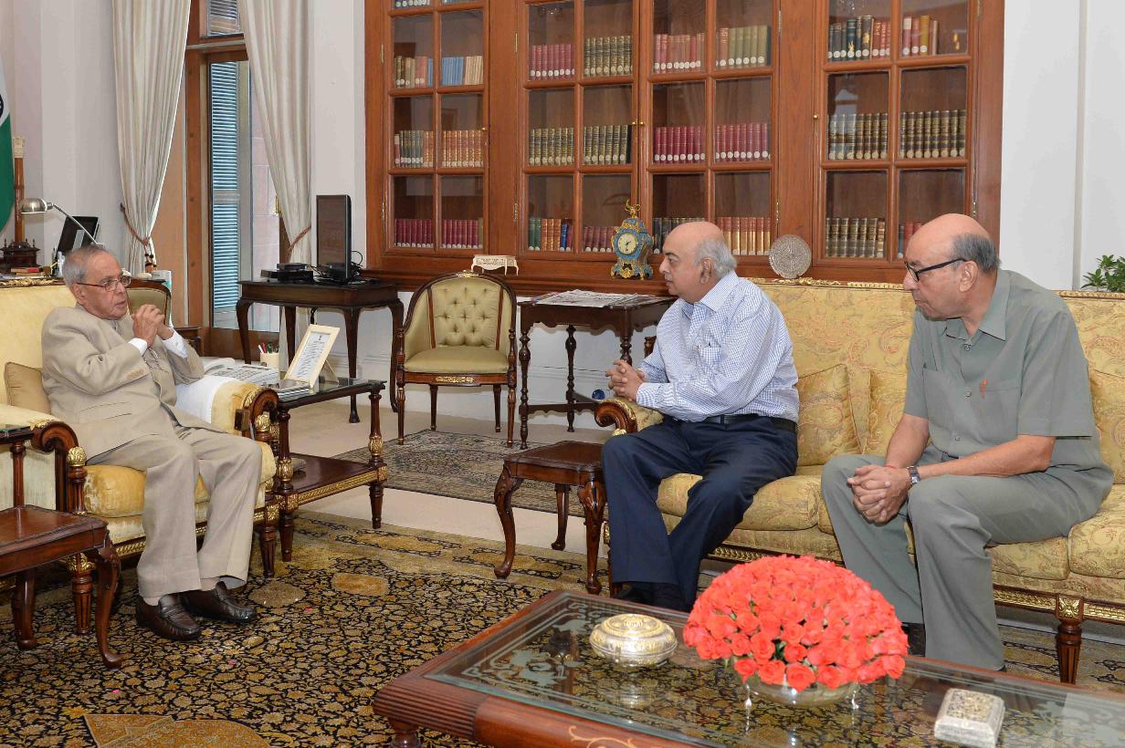 The President of India, Shri Pranab Mukherjee meeting with Shri Om Rajgoria and Shri Nirmal Baid from Kolkata, at Rashtrapati Bhavan, in New Delhi on August 27, 2015.