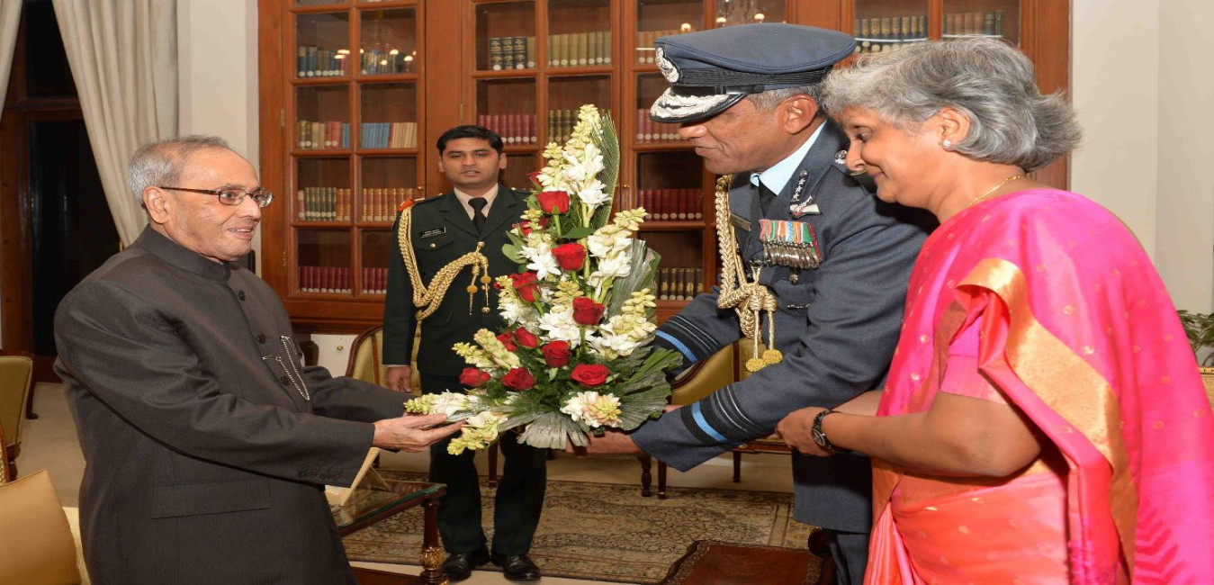 The President of India, Shri Pranab Mukherjee meeting with Air Marshal P.P. Reddy, PVSM, VM, ADC, CISC, HQ Integrated Defence Staff & Hony ADC to the President alongwith his wife Smt. Anuradha Reddy, at Rashtrapati Bhavan on February 16, 2016.