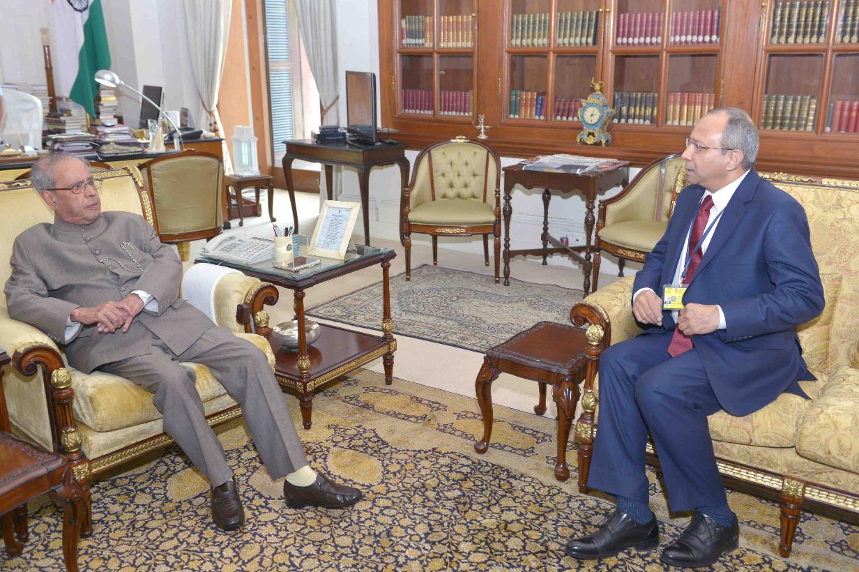 The President of India, Shri Pranab Mukherjee meeting with the High Commissioner of India to Bangladesh, Shri Pankaj Saran, at Rashtrapati Bhavan, in New Delhi on June 24, 2015.