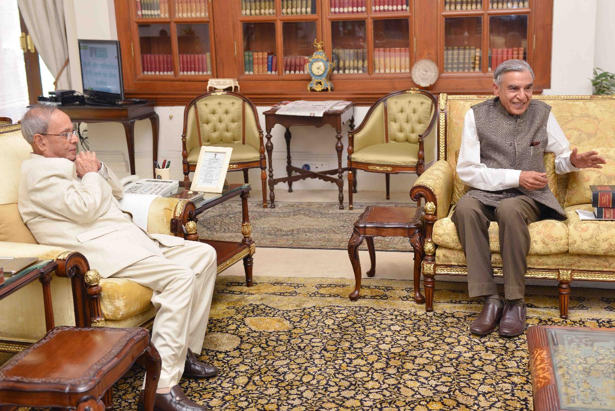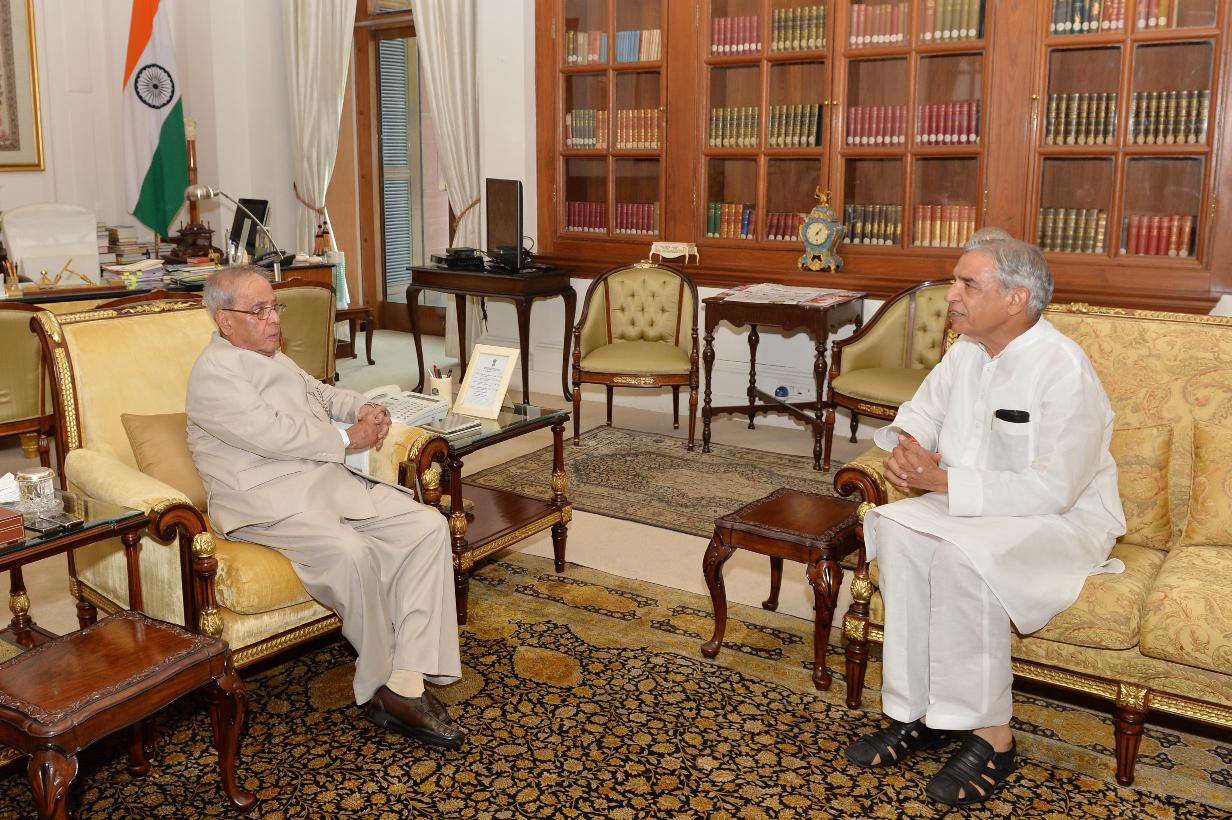 The President of India, Shri Pranab Mukherjee meeting with the former Union Minister, Shri Pawan Kumar Bansal, at Rashtrapati Bhavan, in New Delhi on August 31, 2015.