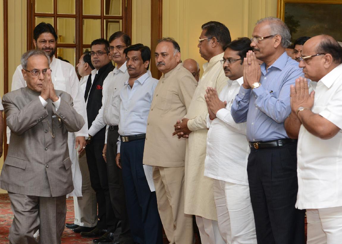 The President of India, Shri Pranab Mukherjee Meeting with Shri Pradeep Jain Aditya , Minister of State for Rural Development alongwith others Delegation from Jain Mahasabha Delhi at Rashtrapati Bhavan in New Delhi on Aug 24, 2013
