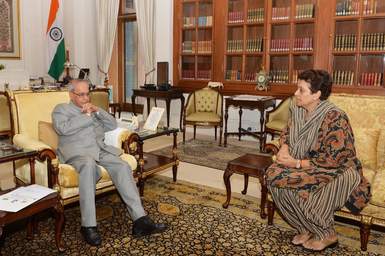 The President of India, Shri Pranab Mukherjee meeting with Ms. Praveen Mahajan, former Chairman, Central Board of Excise & Customs (CBEC), at Rashtrapati Bhavan, in New Delhi on September 08, 2015.