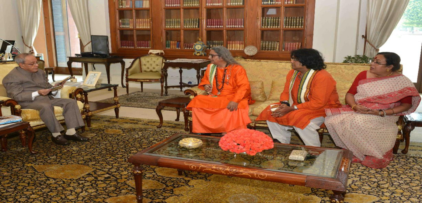 The President of India, Shri Pranab Mukherjee meeting with Shri Purna Das Baul, Shri SP Das, Shri Dyendu Das and Smt. Aditi Das, at Rashtrapati Bhavan, in New Delhi on September 23, 2015.