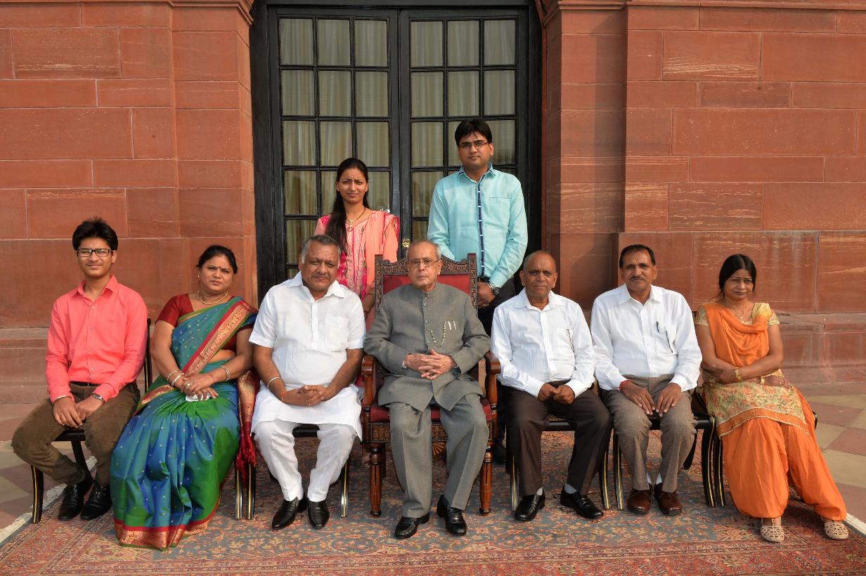 The President of India, Shri Pranab Mukherjee meeting with Shri Pushpinder Latka, Senior Vice President, All India Feroz Gandhi Memorial Society and others from Kaithal, Haryana, at Rashtrapati Bhavan on November 16, 2015.