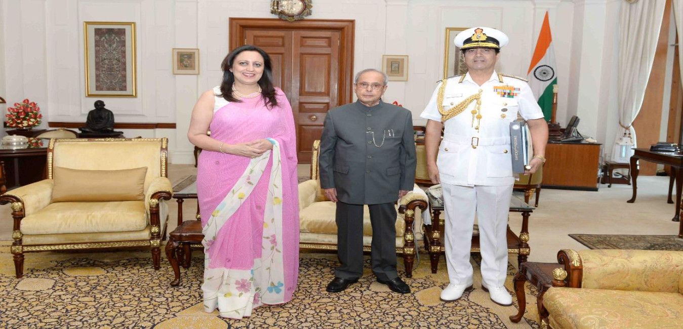 The President of India, Shri Pranab Mukherjee meeting with Admiral R.K. Dhowan, Chief of the Naval Staff and Smt. Minu Dhowan, during a farewell call, at Rashtrapati Bhavan on May 18, 2016.