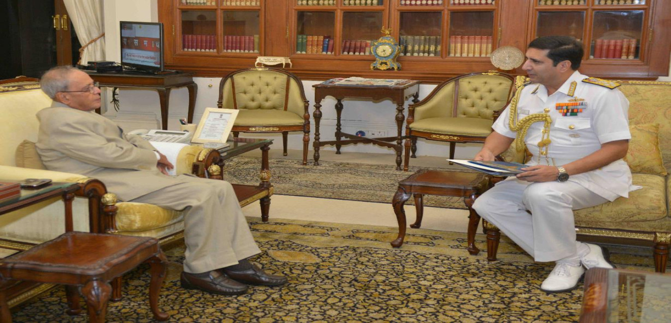 The President of India, Shri Pranab Mukherjee meeting with the Chief of the Naval Staff, Admiral R.K. Dhowan, at Rashtrapati Bhavan, in New Delhi on September 10, 2015.