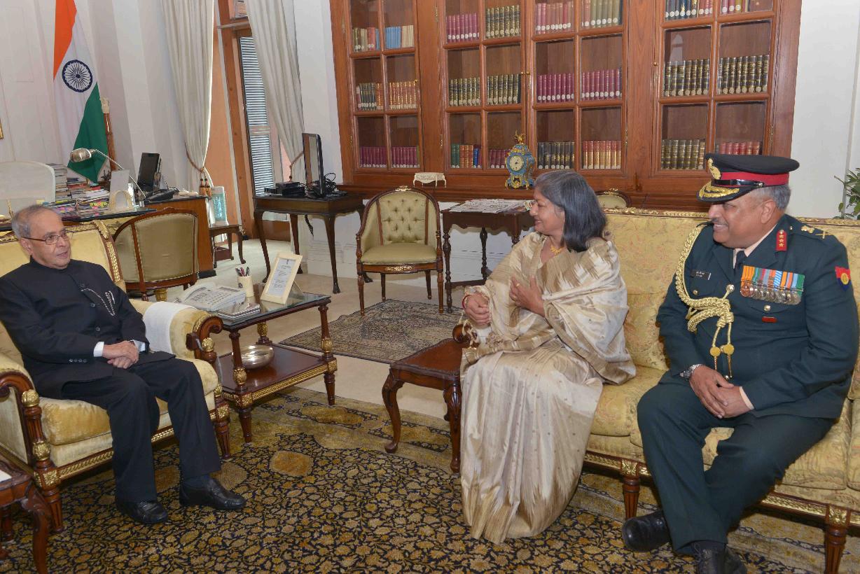 The President of India, Shri Pranab Mukherjee meeting with Lt. Gen. R.P. Rai, Director General, Supply & Transport (ST) & Hony ADC to the President alongwith his spouse Smt. Nirmala Rai, at Rashtrapati Bhavan on February 15, 2016.