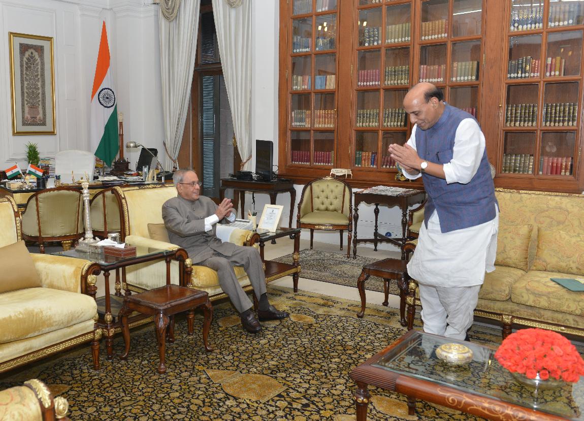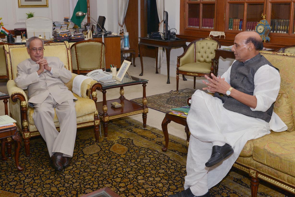 The Minister of Home Affairs, Shri Rajnath Singh calling on the President of India, Shri Pranab Mukherjee, at Rashtrapati Bhavan, in New Delhi on July 29, 2015.