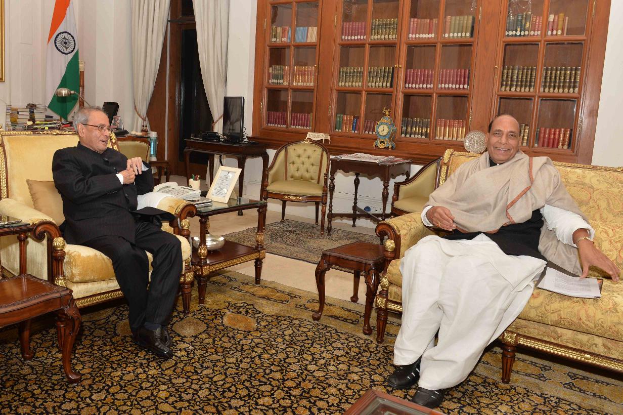The President of India, Shri Pranab Mukherjee meeting with Shri Rajnath Singh, Minister of Home Affairs, at Rashtrapati Bhavan on January 18, 2016.