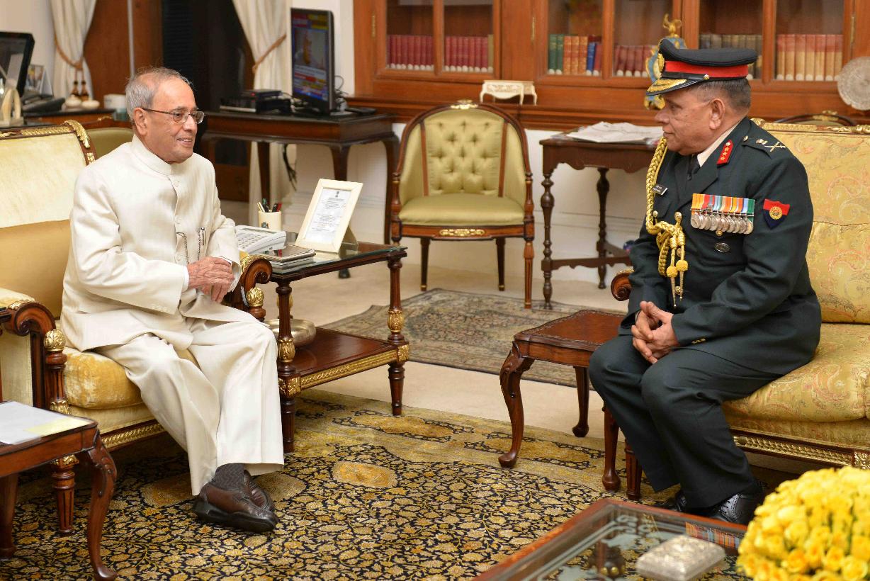 The President of India, Shri Pranab Mukherjee meeting with Lt. Gen. Rakesh Nandan, Director General, Discipline Ceremonial & Welfare (DC & W), AG's Branch & Hony ADC to the President, at Rashtrapati Bhavan on February 12, 2016.