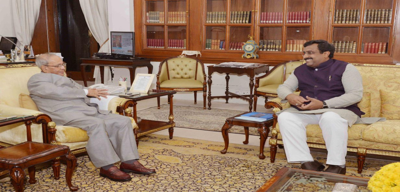 The President of India, Shri Pranab Mukherjee meeting with Shri Ram Madhav, National General Secretary, Bharatiya Janata Party, at Rashtrapati Bhavan, in New Delhi on October 06, 2015.