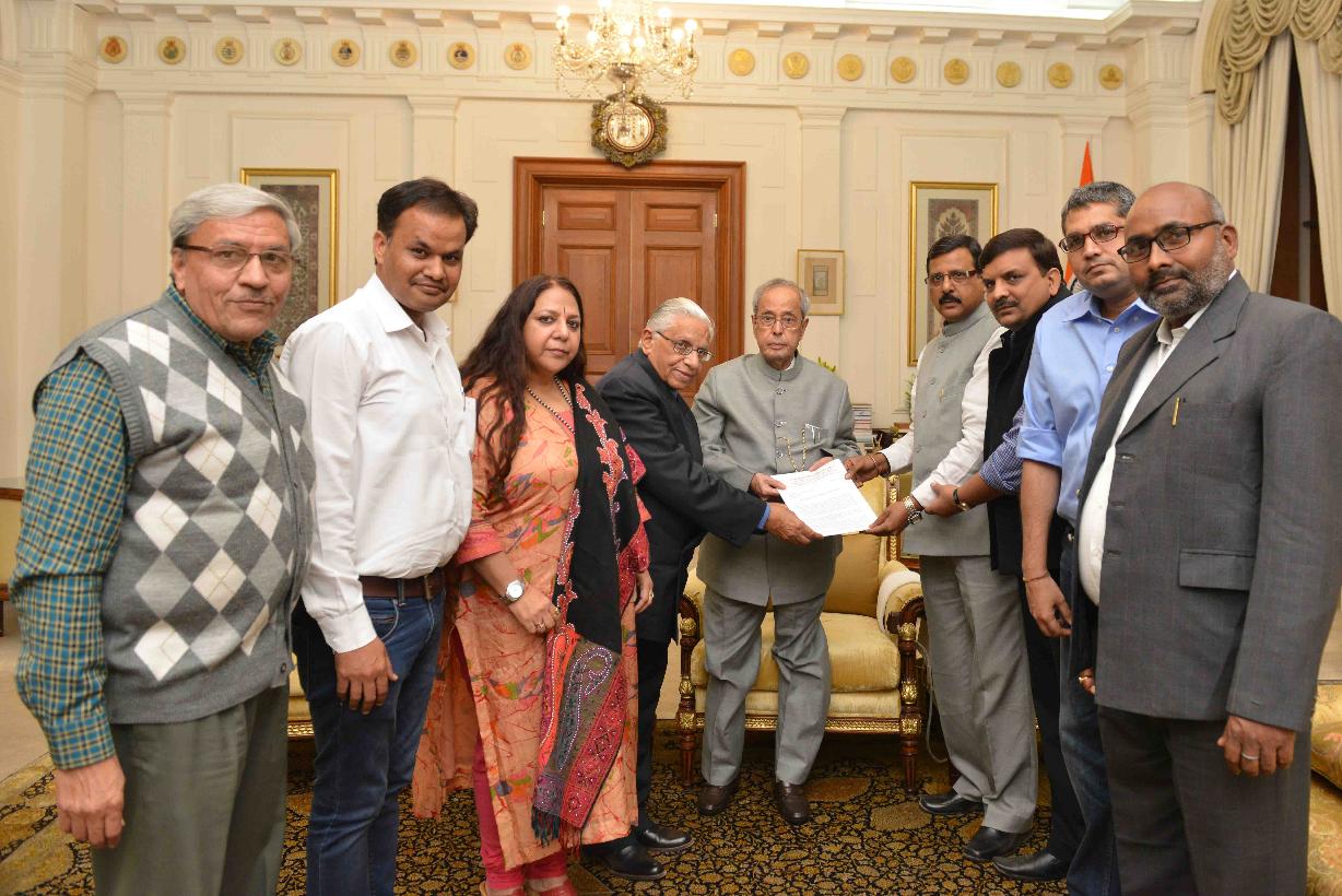 The President of India, Shri Pranab Mukherjee meeting with Shri Ras Bihari, President with others from National Union of Journalists (India), at Rashtrapati Bhavan on February 29, 2016.