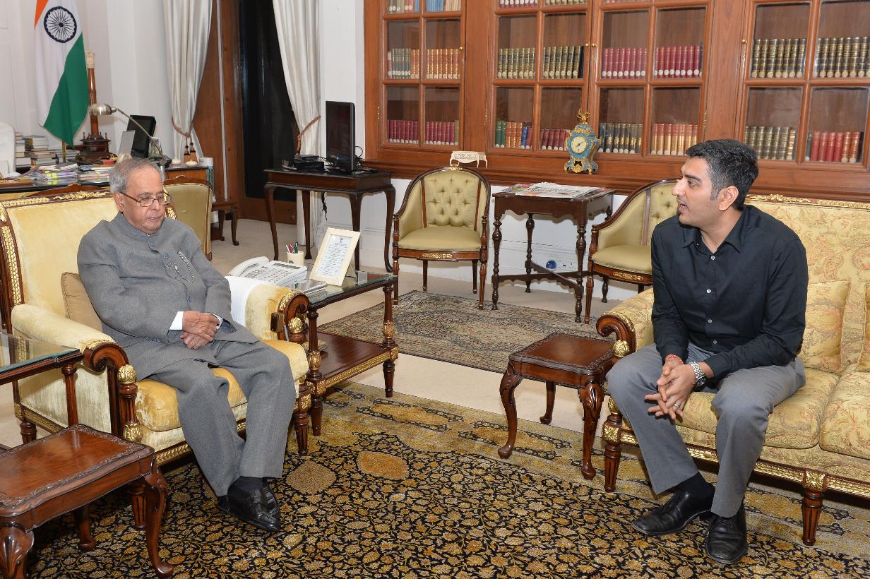 The President of India, Shri Pranab Mukherjee meeting with Shri Rohan Sarkar, at Rashtrapati Bhavan, in New Delhi on August 25, 2015.