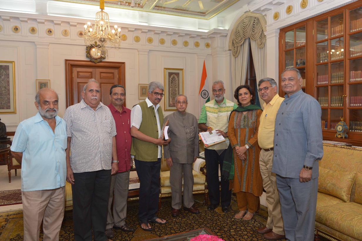 The President of India, Shri Pranab Mukherjee meeting with Shri S.N. Sinha, President with others from Indian Journalists Union, at Rashtrapati Bhavan on September 08, 2016.