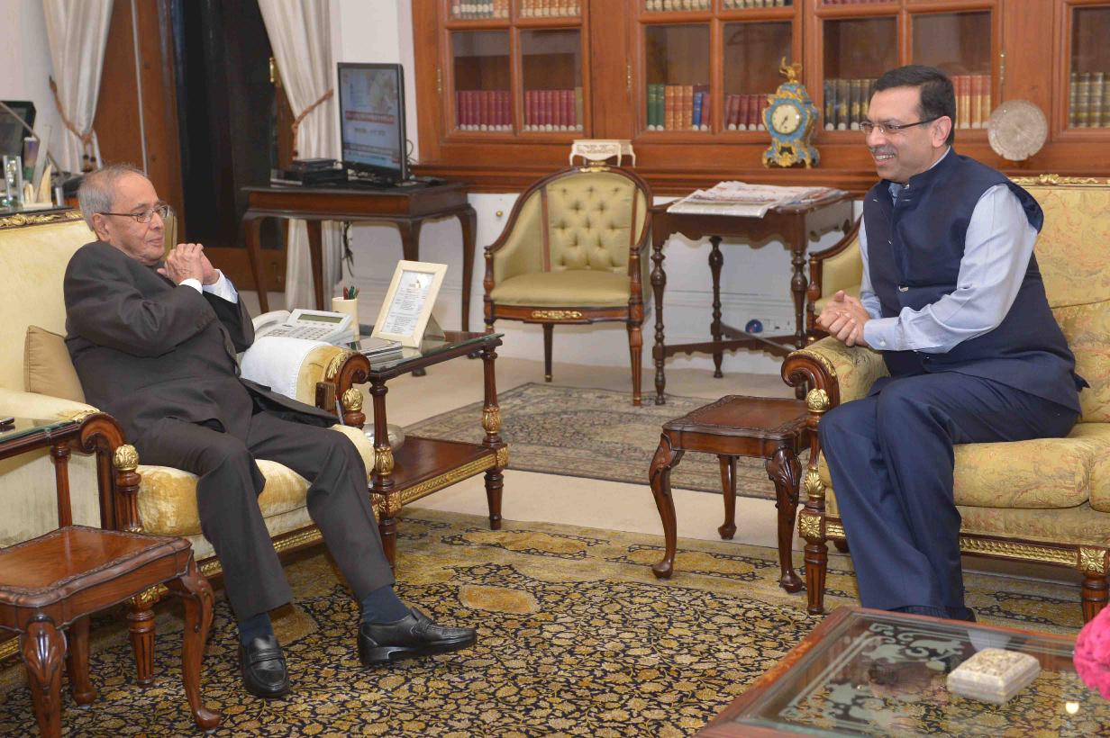 The President of India, Shri Pranab Mukherjee meeting with Shri Sanjiv Goenka from Kolkata, at Rashtrapati Bhavan on December 05, 2015.