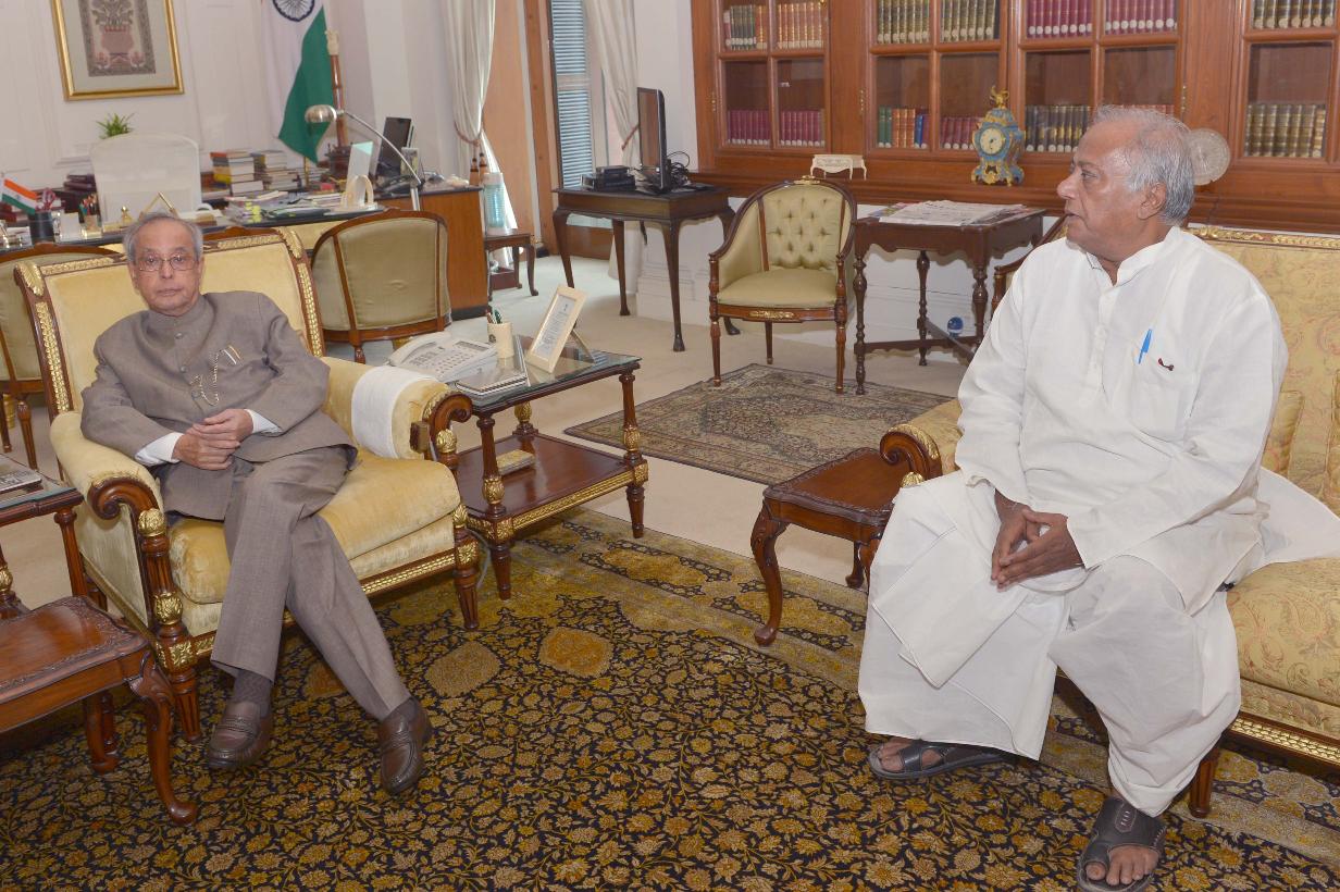 The President of India, Shri Pranab Mukherjee meeting with Prof. Saugata Roy, MP (LS), at Rashtrapati Bhavan, in New Delhi on August 24, 2015.