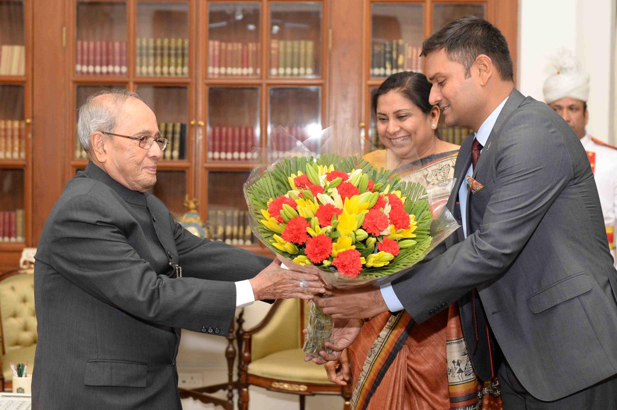 The President of India, Shri Pranab Mukherjee meeting with Ms. Shalini Singh, Jt. C.P., Rashtrapati Bhavan along with Shri Balram, Assistant C.P. (PSO designate), at Rashtrapati Bhavan on February 28, 2017.
